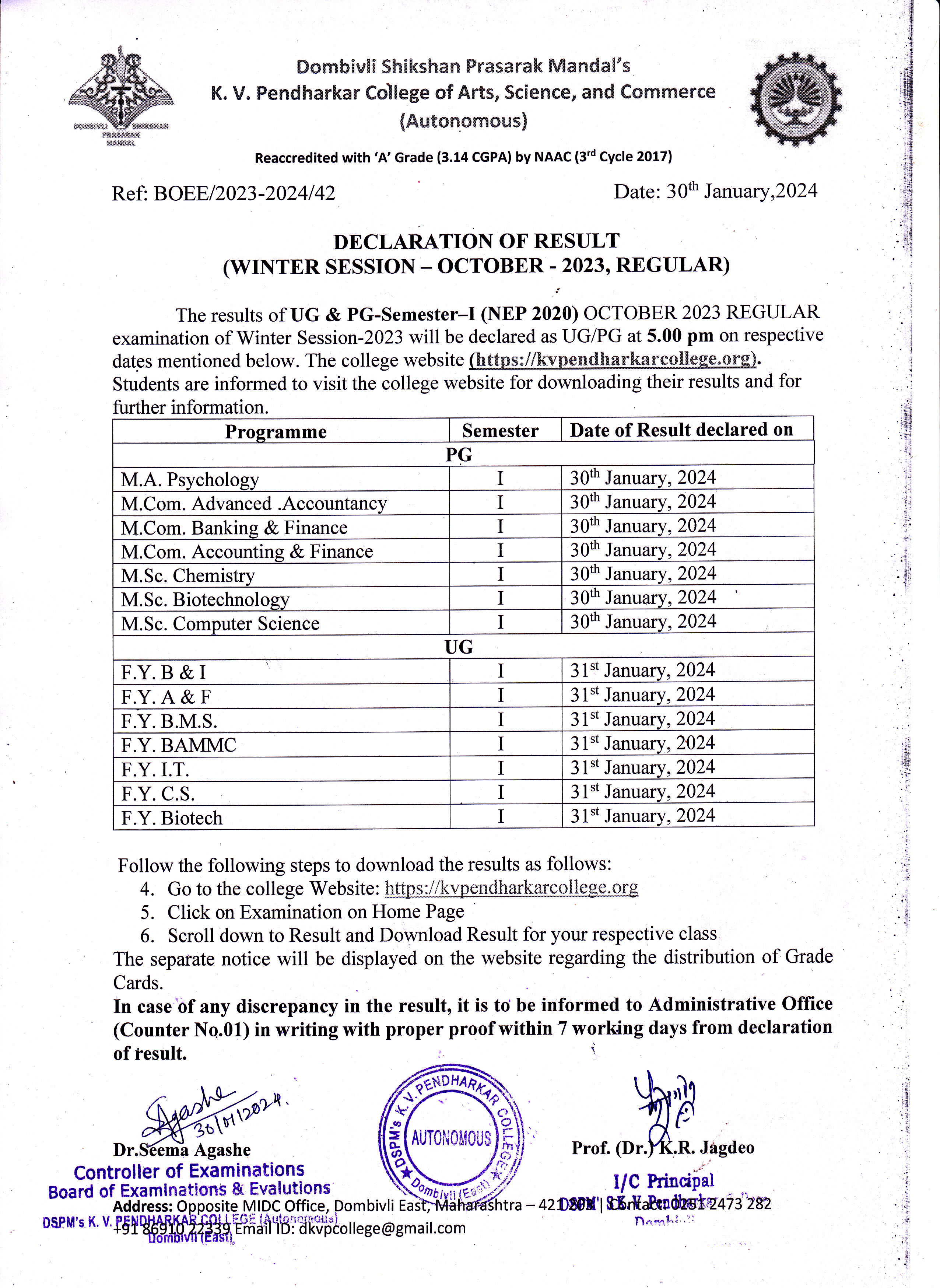 Declaration of Result UG & PG Semester - I